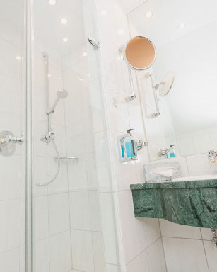 In addition to a stylish marble bathroom (including a cosmetic mirror and hairdryer), each room also has a telephone, free WiFi internet access and a flat-screen TV.